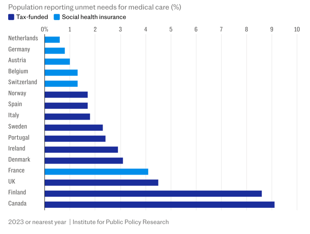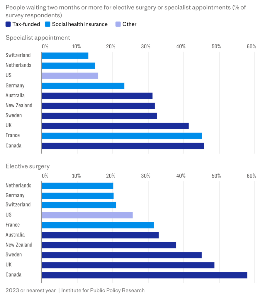 Waiting time data reinforces the point. Around 42 per cent of UK patients report waiting two months or more for a specialist appointment. In Germany, that figure is closer to 24 per cent. In Switzerland, it is nearer 14 per cent. For elective surgery, nearly half of UK patients face extended waits, compared with roughly one in five in Germany and the Netherlands. These are not isolated inefficiencies. They are systemic delays.